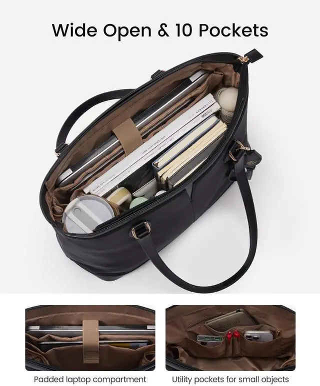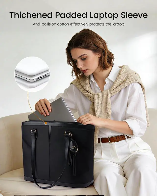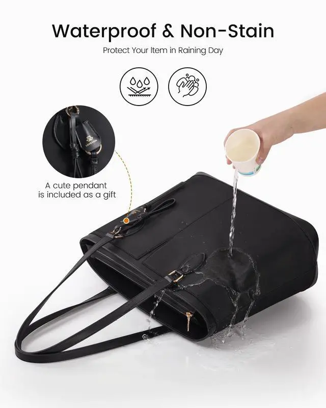 Chic & Lightweight DesignCrafted from premium splash-resistant nylon with elegant PU leather trim, this tote bag for women delivers a polished, professional look without the heavy weight of full leather. Lightweight yet durable, it stays comfortable on your shoulder all dayperfect as a work tote bag, laptop bag for women, or everyday carry ^^ Elastic Pocket for Stanley CupNo more rolling or leaking bottles. Designed with a dedicated interior elastic water bottle pocket, this tote securely fits large 40 oz tumblers. Keeps drinks upright to prevent spills while protecting your laptop, documents, and daily essentialsideal for busy workdays and travel ^^ Large Capacity with Thickened Laptop ProtectionSized at 18.5"L x 6.8"W x 14"H, this laptop tote bag features a thickened padded compartment that safely holds laptops up to 17.3 inches.