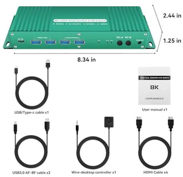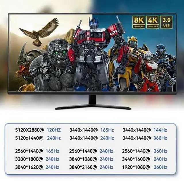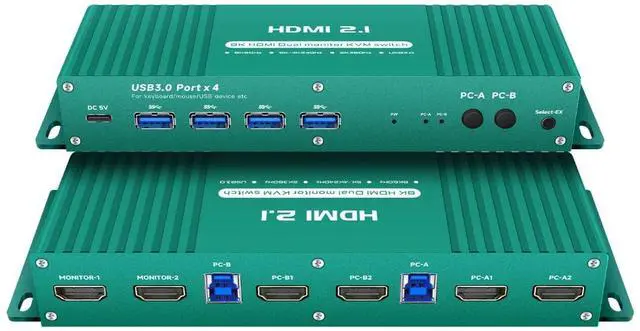 It is HDMI 2.1 2 Port KVM HDMI 2.1 2 in 2 out. The KVM Switch 2 Computers 2 Monitor HDMI sharing one set of keyboard & mouse, 1 HDMI 2.1 monitor, and 2 pcs USB 3.0 peripheral devices. 2 pcs USB 3.0 hub (data transferring rate up to 5Gbps/s, 10 times faster than USB 2.0 ), 2 kits cables and a wire remote push button switch. The HDMI KVM Switch is Recommend resolution 5120x1440@60Hz, 5120x1440@75Hz, 5120x1440@120Hz, 5120x1440@144Hz, 5120x1440@165Hz, 3440x1440@75Hz, 3440x1440@100Hz, 3440x1440@144Hz, 3440x1440@165Hz, 3440x1440@175Hz, 7680x4320@60Hz, 3840*2160@60Hz3840x2160@144hz3840x2160@175hz, 3840x2160@240Hz, 2560*1440@165Hz, 2560*1440@144Hz, 3840x1600@144Hz, 3840x1600@165Hz, 3840*1620@144Hz, 3440*1600@144Hz, 3840*1080@240Hz, and so on.