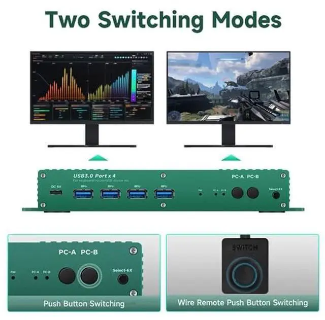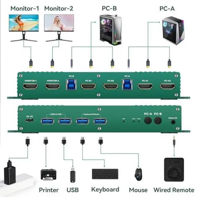 The KVM HDMI 2 PC 2 monitor Switch for 2 Computers Dual Monitor, manual button switching, wired remote push button switching. The KVM switch