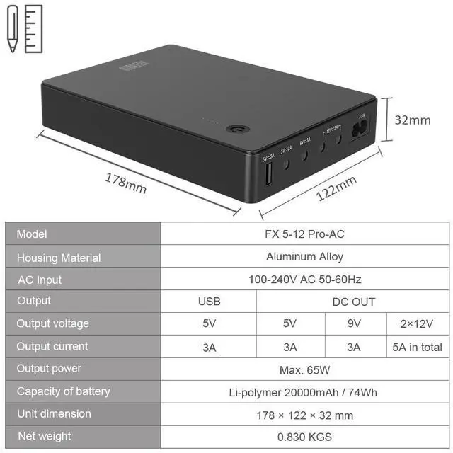 No Standalone lithium batteries are sold with the product. ^^ Mini uninterrupted power supply for power outage, compatible with router, modem, security camera, telephone, fax, printer, fingerprint recorder, LED strip lights, ect, and can still use the network in case of power outage. ^^ Alumimum housing, Output maximum 60W, 15V USB, 15V DC, 19V DC, 212V DC, can support router and modem at the same time. ^^ Built-in 20000mAh (74Wh) batterypack with a standard USB output, can be used as a normal power bank as well.
