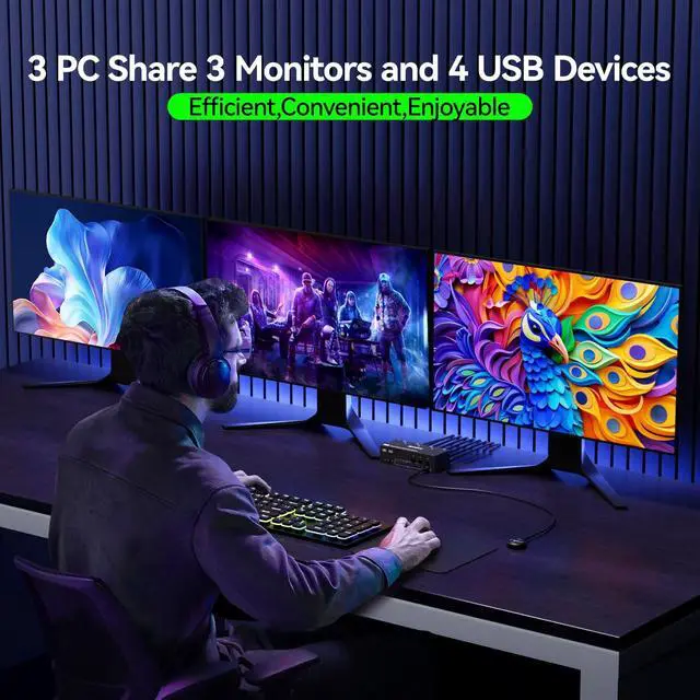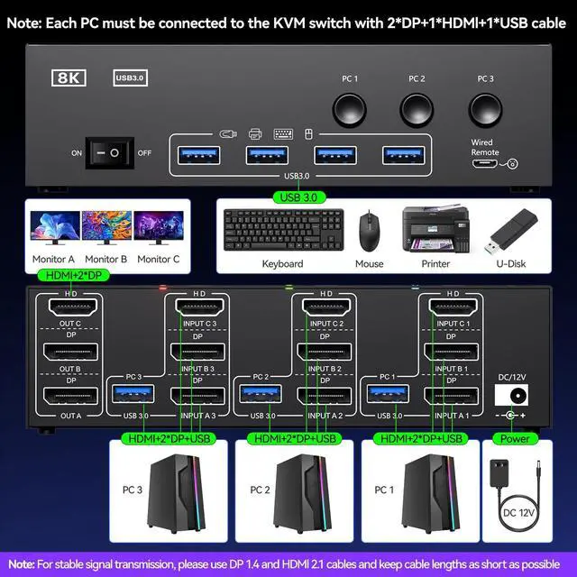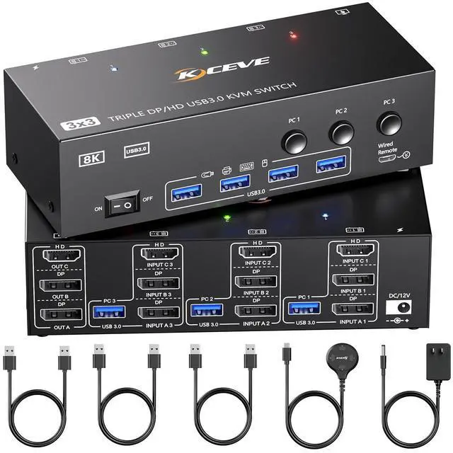 KVM Switch 3 Monitors 3 Computers This 3 Monitors KVM Switch effortlessly connect 3 PC to share 3 monitors (supports extended & mirrored display modes) and 4 high-speed USB 3.0 ports.: Extended mode drives 3 distinct screens; mirrored mode duplicates the same content across all 3 displays. ^^ 8K Ultra HD Triple Monitor KVM Switch HDMI 2.1 & DP 1.4 enabled 3 monitor KVM switches supports up to 8K@60Hz, 4K@144Hz & lower resolutions, delivering crystal-clear visuals with sharp, detailed imagery. ^^ 3 Monitor KVM Switch with 4 USB 3.0 Ports KVM Switch 3 computers 3 monitors integrated 4 USB 3.0 ports for keyboard, mouse, printer & USB drives Supports 5Gbps ultra-high-speed data transfer (10x faster than USB 2.0 ). ^^ Great compatibility & 2 switching modesKVM switch 3 monitors driver-free for Windows, Mac, Linux, Unix. Support Laptops and desktops. Widely applied for home, Office, etc. You can press the button or use wired remote (included) to switch the 3 computers. Three color LED indicate the active computer. ^^ You Will Get1* Triple monitor KVM Switch, 3* USB 3.0 cable, wired remote, 12V power adapter and user manual. ANGEET provide 1 year war-ranty. This 3 monitors KVM switch has three independent circuit boards, A, B and C, suitable for 3 computers to share 3 monitors, 2 monitors or 1 monitor, giving you more choices.