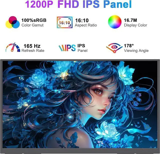 Ultra-Smooth 165Hz Refresh RateEnjoy a seamless gaming experience with this portable monitor featuring a165Hz refresh rate and 1ms response time, perfect for gaming on PS5, laptopsor desktops. ^^ 16-Inch lIPS FHD DisplayThe FHD 1200P resolution provides sharp visuals, while the 16:10 aspect ratioand HDR support ensure immersive viewing, making it ideal as a portable monitor for laptops and gaming. ^^ Vivid IPS Display with HDR SupportThe monitor features a 16-inch IPS screen with 100% sRGB color accuracy, HDR and a 1ms response time, making it ideal for professional use, gaming, and media consumption.
