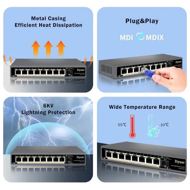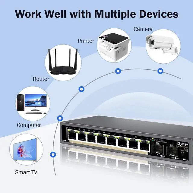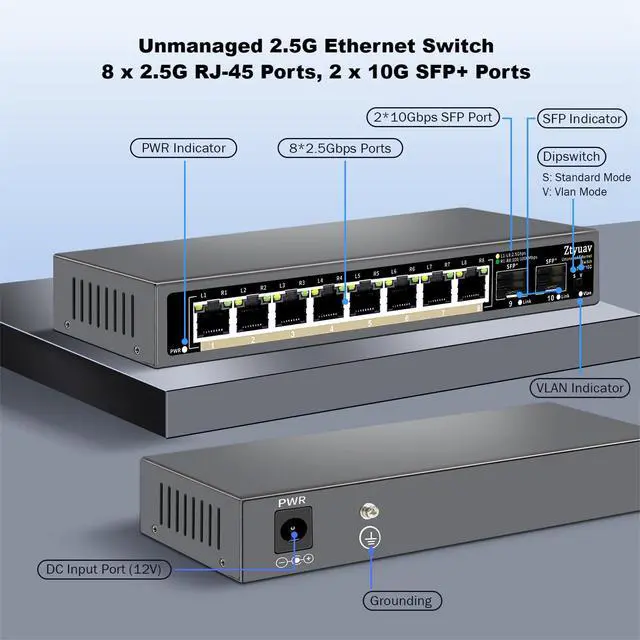 2.5G High-Speed TransmissionEquipped with 8 x 2.5G Ethernet ports and 2 x 10G SFP+ ports, which can support bandwidth up to 80Gbps. All ports can achieve non blocking line speed forwarding. ^^ Port Speed Auto-NegotiationThe ports of switches are compatible With 100/1000/2500Mbps, can automatically select the appropriate communication rate, allowing two connected devices to communicate at the highest common rate to ensure stable and efficient data transmission. ^^ Standard/VLAN ModeStandard mode or VLAN mode are optional. Under the VLAN mode, our switch can isolate broadcast storm and prevents mutual communication between ethernet ports on the left of the switch to improve Lan security and data transmission.