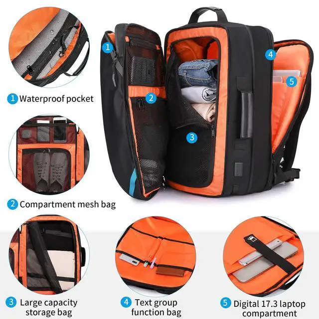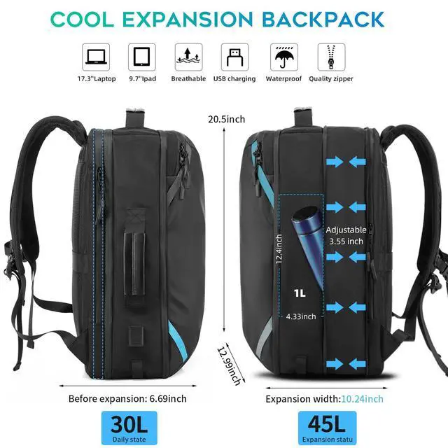 DescriptionTravel Carry on Backpack, Extra Large Expandable 45L Backpack for Flight approved, 17.3" Laptop with USB Charging Port Backpacks, Water Resistant Computer Business Backpack for Men & Women (black)