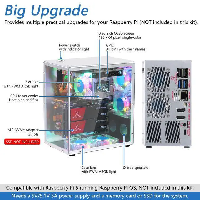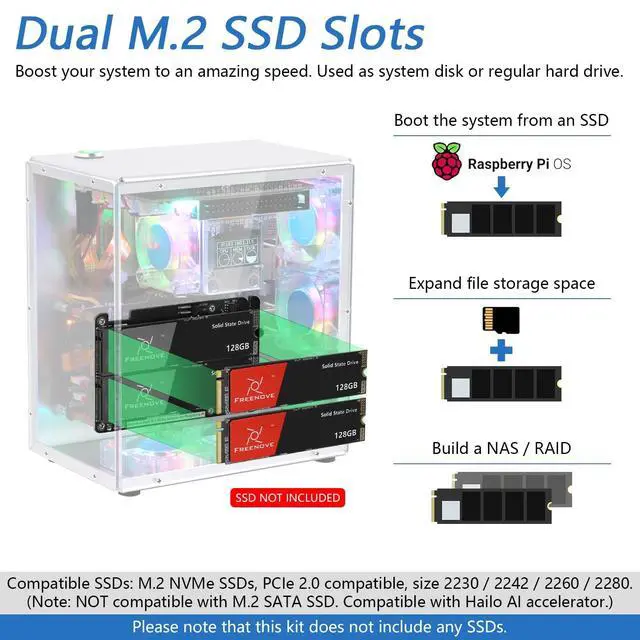 GPIO header (Note: Compatible with Raspberry Pi 5 running Raspberry Pi OS, NOT included in this kit. Needs a 5V/ 5.1V 5A power supply and a memory card or SSD for the system) ^^ Dual M. 2 SSD Slots (SSD