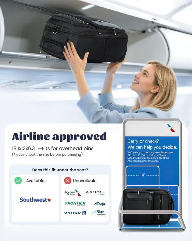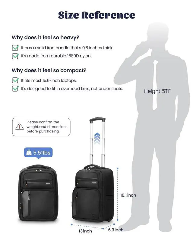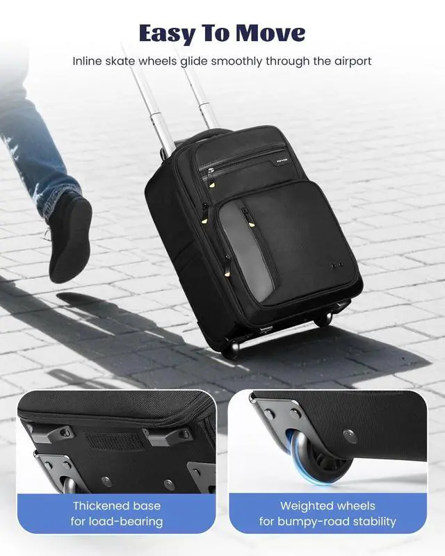 Please make sure to check the dimensions and weight before buying ^^ Wondering about airline compatibility? This rolling backpack measures 13" x 6.3" x 18.1" and weighs 5.51 lbs, meeting most airline carry-on requirements. It fits easily into overhead bins (not under the seat), so you can say goodbye to baggage fees ^^ Don't be fooled by its compact size! The main compartment fits five pieces of clothing plus a 15.6 -inch laptop. On the outside, you'll find quick-access pockets and a water bottle holder. Multiple pockets keep your items secure and easy to reach ^^ Tired of awkward, stuck wheels? Our rolling backpack with wheels features durable, smooth-gliding inline wheels that stay on track.