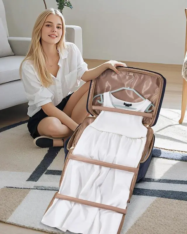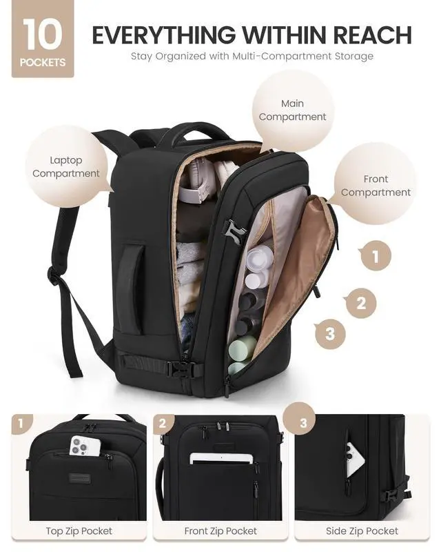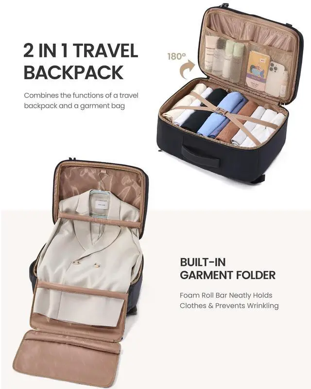 Travel Backpack&Garment Bag This innovative backpack seamlessly combines a travel backpack with a garment bag, featuring foam roll bars that securely hold suits, shirts, and dresses in place, keeping them wrinkle-free during trip and transit. ^^ Spacious 40L with Organized Packing With a 40L capacity and 3 extra packing cubes for a 3-5 day trip, this carry on backpack efficiently store clothes/shoes, cosmetics/toiletries, a 17.3" laptop and more, keeping your items neatly arranged. ^^ Multiple Pockets for Convenience Equipped with 10 pockets, including 3 front pockets for quick access to essentials, such as passport, rechargeables, tissues and more.