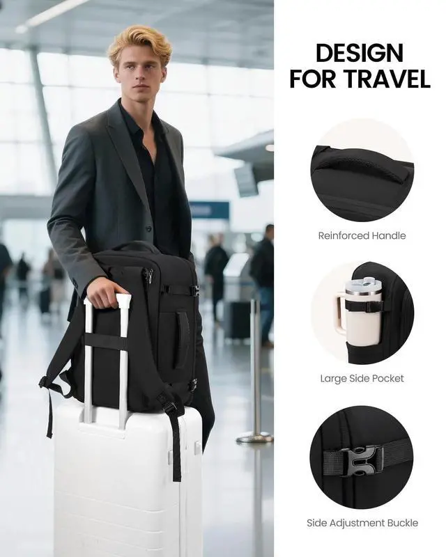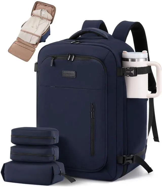 A roomy wet/dry pocket accommodates all types of toiletries, and a 40 oz. water bottle fits easily in the side pocket. ^^ Effortless Travel DesignThis backpack meets airline personal item limits. The 180 opening makes airport security checks a breeze. Securely attach your backpack to your suitcase using the luggage strap and enjoy hassle-free mobility. ^^ Durability Meets ComfortDesigned for comfort on the go, this backpack features high-quality, durable materials. It has padded shoulder pads to relieve back stress. Thick padded compartments protect laptops and tablets. ^^ Adaptable for Versatile OccasionWith sturdy side handles, this backpack offers versatile carrying optionshandheld, over-shoulder, or luggage-mounted.