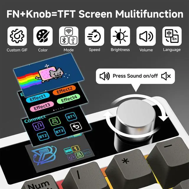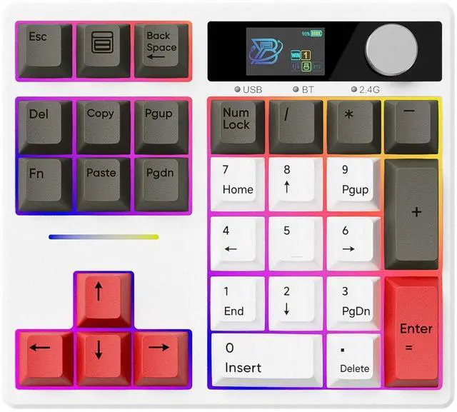 ROTARY KNOB AND COLOR SCREEN: The mechanical numeric keypad with color smart display is an interactive interface that can be updated and customized in real time. The multifunctional display can switch language, connectivity, operating system and lighting effects. Multimedia knob for volume and screen control. This mini small numpad strikes the perfect balance between functionality and space-saving design ^^ TRIPLE MODE CONNECTION & 1000MAH