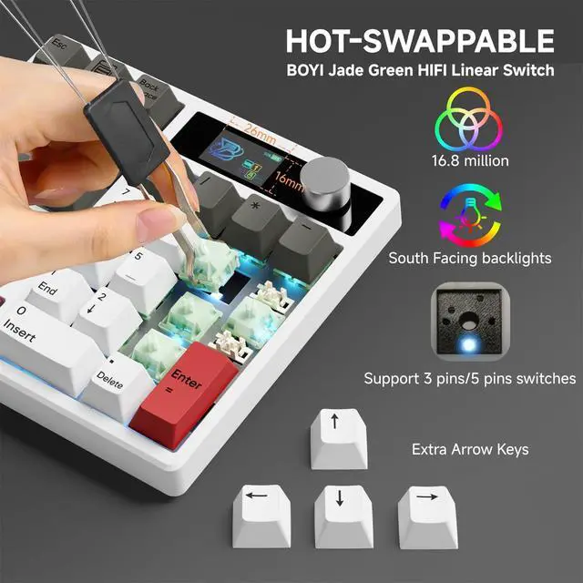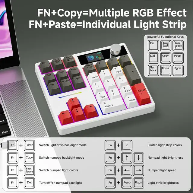 CAPACITY BATTERY: This wireless mechanical number pad supports Bluetooth 5.0 / 2.4GH z/Type-C connection modes. Bluetooth effectively reduces power consumption, press FN+1/2/3 to switch between three devices, and the detachable USB-C cable can be recharged while in use. The numeric keypad also features a high capacity 1000mAh battery that ensures long hours of use ^^ GASKET MOUNT & HOT SWAPPABLE SWITCHES: Features gasket structure which offers a soft and bouncing typing experience. Cotton are equipped to absorb sound while typing and also reduce sound of bottom case. This custom numpad with hot-swappable base supports 3-pin or 5-pin mechanical switches replacement. You can easily DIY your own keyboards without soldering issue ^^ SOUTH-FACING LEDS & STREAMING LIGHT BAR: This light up keyboard features south-facing backlighting for a stylish look. FN+COPY to switch backlighting mode and FN+PASTE to switch light bar mode. You can also easily control the brightness and speed of the light, allowing you to personalize your keyboard ^^