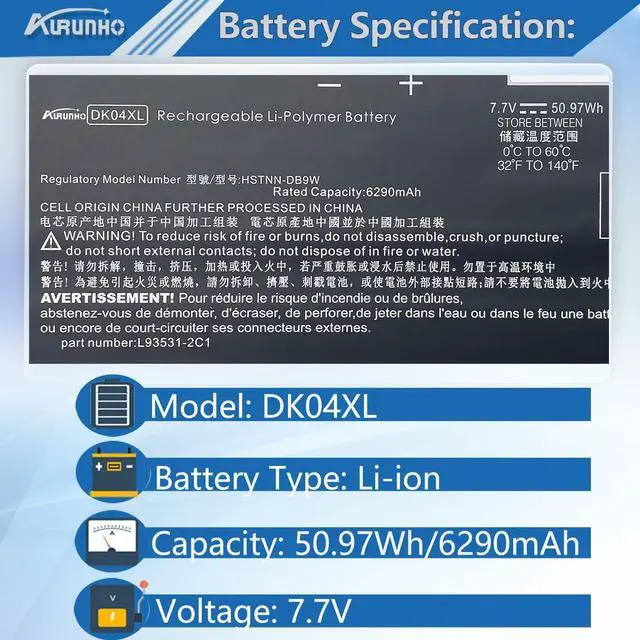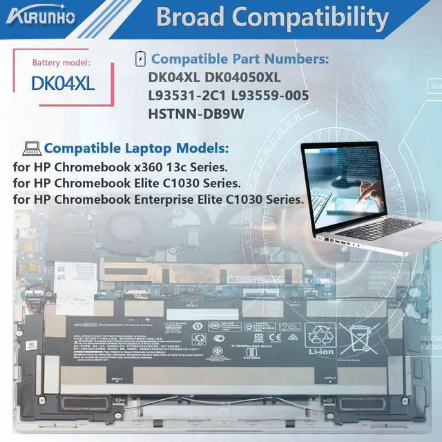 Color: Black. 100% brand New from Manufacturer. ^^ Fits Modelsfor HP Chromebook x360 13c Series, Elite C1030 Series, Chromebook Enterprise Elite C1030 Series. ^^ Compatible P/N DK04XL, HSTNN-DB9W, L93531-2C1, L93559-005, DK04050XL. ^^ SecurityALL of our battery is CE, FCC, RoHS Certified. And have passed a series tests of short circuit, overheating, and overload protection before shipments for safety. ^^ AURUNHO After-sales We guarantee 30 days money-back and 12-month warranty; 24 x 7 email support. For any battery questions you fell free to contact us via "Your Orders" tab in your account, we will be glad to help you within 24 hours.
