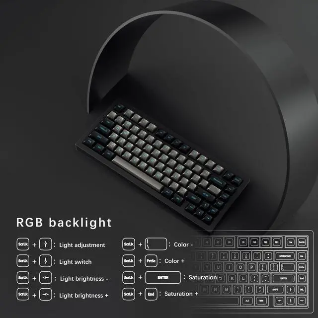 ^^ RGB Custom Keyboard: Detachable C-type data cable, RGB backlighting, light adjustment, light switch, and brightness control.