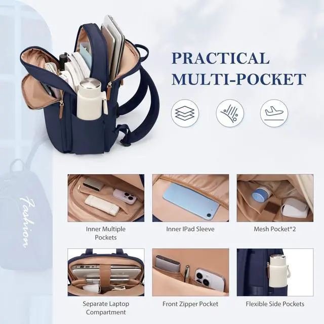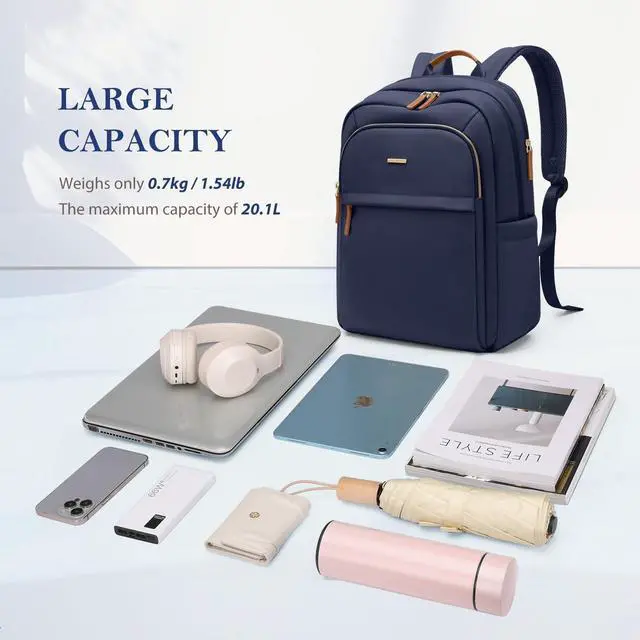 Backpack Dimension 29.5 *44* 15.5CM / 11.61 * 17.32 * 6.1 inch ^^ MultifunctionThis travel backpack has a multi-layered design and has been optimized and upgraded to add more internal layers than other backpacks. The appearance also adds a headphone bag, which can easily carry a plugged earphone. Separate laptop compartments provide secure storage for your devices. The main compartment includes a zipper opening and two open pockets for easy storage. In addition, there is a front zipper pocket, two side pockets, and a luggage strap in the back. ^^ Upgraded FabricDurable and waterproof, this womens backpack is made of splash-proof Oxford fabric and premium superfiber synthetic leather, this travel backpack ensures that your items stay dry and prevents any leaks or moisture from affecting your other items.