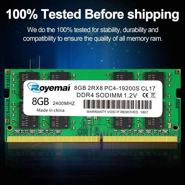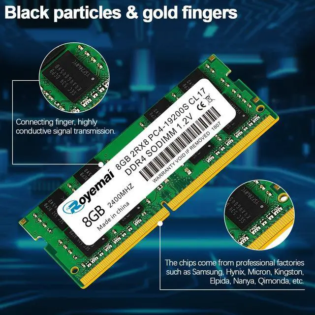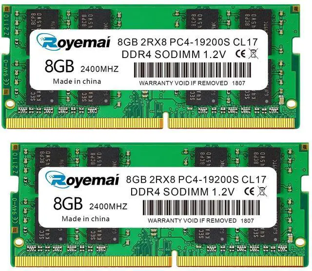16GB DDR4 19200S PC4 2400 2X8GB SODIMM, DDR4-2400MHz PC4-19200 CL17 2Rx8 1.2V Non-ECC 260 Pin Laptop Memory Module RamPlease Kindly Note: In case the RAM cannot fit your computer, please ensure the parameters before you purchase, such as the RAM model, RAM slot and maximum memory of your computer. High StabilityHigh-quality originals, strict process. All chips from large brands, through strict testing and screening testing. Advanced electroplating process is applied on the connecting finger will improve corrosion resistance and electrical conductivity. After Long-time burn in test and temperature tolerance test aiming at major system platform, it approves that ROYEMAI memory owns high stability and performance. Faster and SmootherROYEMAI RAM is designed to help your system run faster and smoother, one of the easiest ways to improve your system's performance. Load programs faster, increase responsiveness, run data-intensive applications easily and increase your laptop's multitasking capabilities. After install larger memory, computer will respond noticeably faster, particularly with lots of windows open. High CompatibilityTo make sure itll be compatible with Intel, AMD System well, ROYEMAI RAM has been through compatibility testing with all popular brands of motherboards. Test results show that memory is able to offer superior performance and high stability required during long time operation for any brand computer.