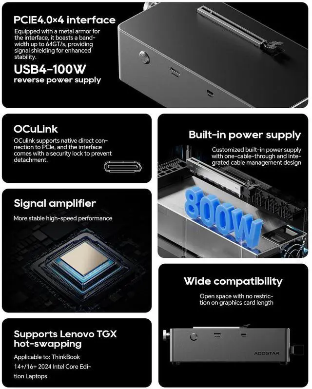 Note: This external GPU dock is only compatible with devices with an Oculink port. Please check in advance. OCuLink and TGXOCuLink interface provides 64Gbps effective bandwidth in PCIe 4.0 x4 lanes and the base is hot-swappable 2024 Lenovo ThinkBook 14+ / 16+ Core Edition Laptop TGX Interface For interface. ^^ AG02 EGPU dock specifications