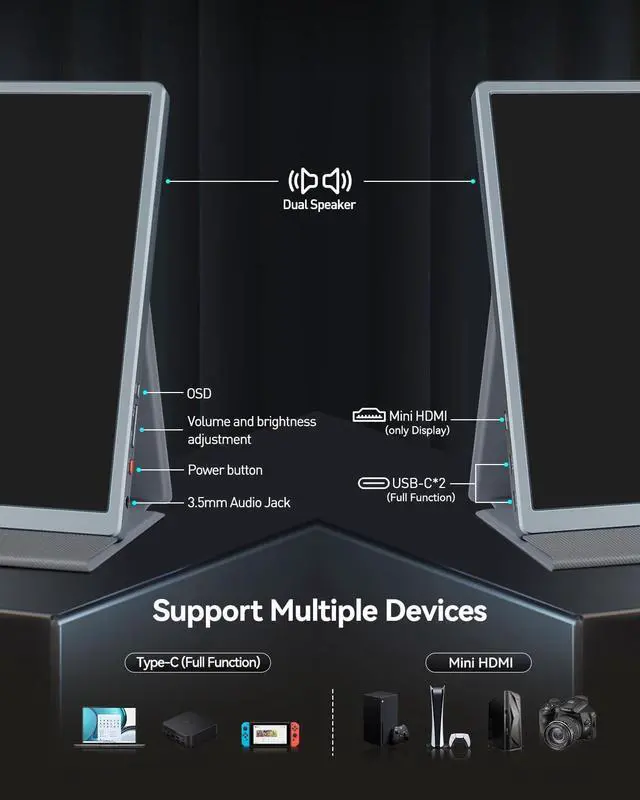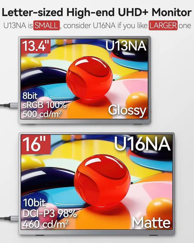 [Sleek and Minimalist Design] This high-end portable monitor features ultra-narrow bezel, ultra-light weight and ultra-thin body. The enclosure is made of aluminum with anodizing space gray. It has clean lines, unobtrusive form which allows you to focus more on the content displayed on the screen. The overall esthtic adds a touch of sophistication, elegance and high-techfeel to your desk setup. The monitor is perfect for those who value both style and functionality in their workspace. ^^ [Highest Resolution and Golden Ratio] This monitor features an exceptional 16:10 aspect ratio and a 13.4 -inch screen with 3840x2400 resolution, providing a stunning viewing experience.