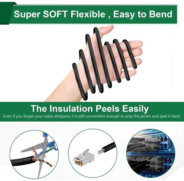 Our Advantages: Very soft, flexible, smooth, untangled, and easy to bend-----Coming packaged in a hassle-free & easy-pull box-----The whole cable has runned "ft" count after every foot which makes measuring the cable easy-----The Insulation Peels Easily, even if you forget your cable strippers-----24 AWG CCA CONDUCTOR ^^