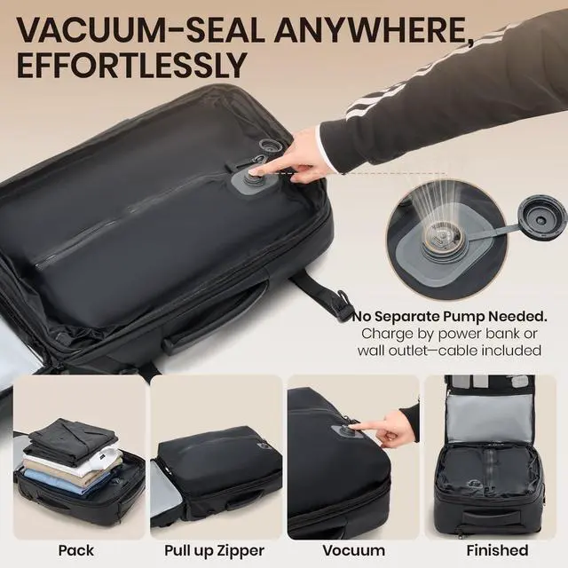 All-In-One Design: The vacuum backpack utilizes a single vacuum compression system which merges pump and compressionno separate parts, eliminating loss or compatibility issues. How to use? Lay compressibles (eg. clothes) flat in the vacuum travel backpack. Zip shut completely. Press your palm evenly along the seam to prep for max efficiency. Hold the vacuum button ~2 seconds; once compressed, press again to power off. Seal the cap tightly on the open end. Simple, space-saving, and hassle-free ^^