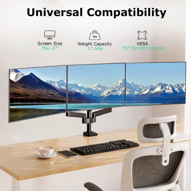 Universal CompatibilityThe triple monitor stand is perfectly suited for most flat or curved computers whitch size is 17-27 inches. Each arm holds up to 17.6 lbs, compatible with VESA patterns 75x75mm and 100x100mm. If there are no VESA holes in the back of your monitor, a VESA adapter is needed. ^^ Desk Space SaverThe triple monitor stand mount get 3 monitors off your desk and help you get a lot of desktop space. Integrated cable management system keeps your power and AV cords organized. Just enjoy your time working, playing or watching in a clean and comfortable environment.