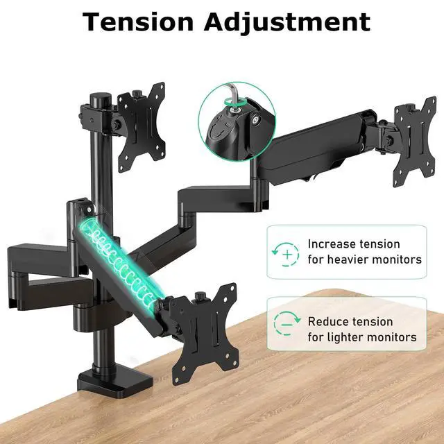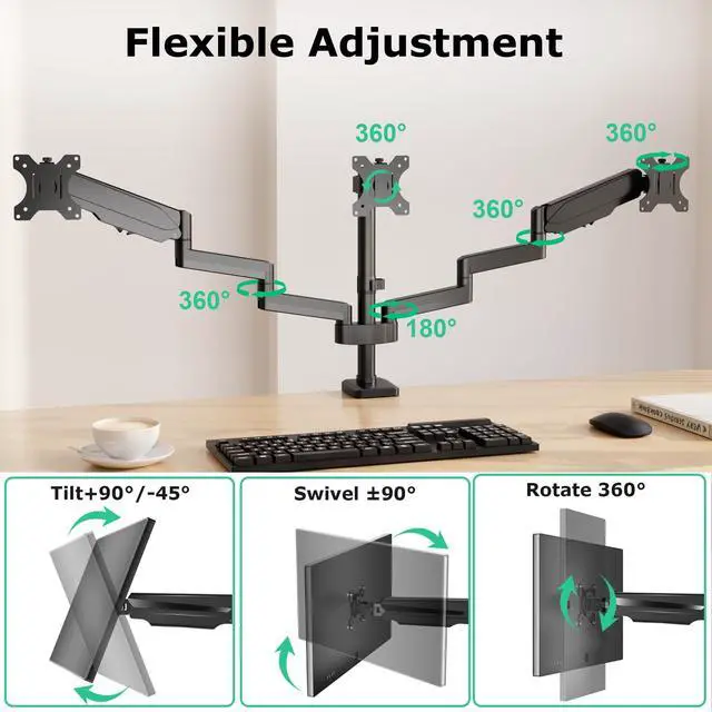 ^^ Built to LastThe triple monitor desk stand is made of upgraded steel and premium gas spring arm that has been tested to withstand 25, 000 lift cycles to ensure long-lasting performance. ^^ Two Mounting OptionsThe 3 monitor stand supports C-clamp and grommet mount, both options securely hold your monitor. C-clamp (drill-free) fits desktop thickness 0.39 "- 3.35". Grommet mount fits desk thickness 0.39" - 3.35" and desktop hole diameter of up to 2.4". ^^ Easy InstallationThe triple monitor mount comes with all mounting hardware, tools, and instructions necessary for assembly.