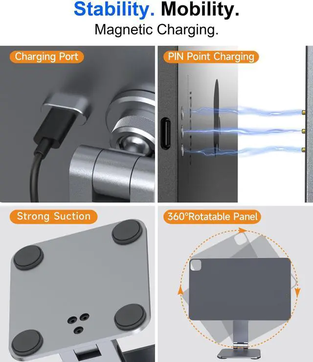 Aluminum Alloy & Suction Base: Crafted with premium aluminum alloy and a reinforced suction cup base, this magnetic iPad stand ensures rock-solid stability. Strong magnetic attraction holds your device firmly.