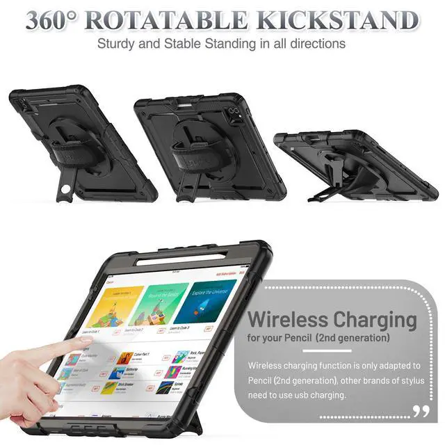 Screen Protector: The case for iPad Pro 12.9 is composed of hard PC frame, soft flexible silicone and non-slip lining as well as built-in screen protector, providing your tablet with full body protection against accidental drops, shocks, scratches or bumps ^^ 360 Rotating Stand & Hand Strap & Detachable Shoulder Strap: The sturdy kickstand will not only help your hands-free but also provide more flexible and comfortable angles for viewing or typing; The hand strap makes it easy for you to use the device with single hand while the shoulder strap makes it more convenient to carry the case for iPad Pro 12.9 during your outdoor working, travelling or climbing ^^ Cut-outs / Pencil Holder /