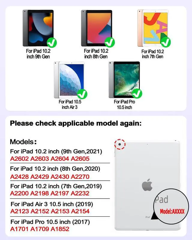 Compatible DevicesThis keyboard case is only compatible with iPad 9th Generation 10.2 inch (A2602, A2603, A2604, A2605). iPad 8th Generation 10.2 inch (A2428, A2429, A2430, A2270). iPad 7th Generation 10.2 inch (A2200, A2198, A2197, A2232). iPad Pro 10.5 (A1701, A1709). iPad Air 3rd 10.5 (A2123, A2152, A2153, A2154). Not suitable for other iPad devices. Please check the model number starting with ""AXXXX"" on the back of your iPad before purchasing (Note: Pencil and iPad are not included in this Product) ^^ Magnetic Floating Stand, Multi-Angle AdjustableThis magic style keyboard case built-in strong magnets, which can adsorb iPad's back cover on the shell and can be removable. The floating cantilever stand design allows you to easily adjust the angle of iPad. Whether it is typing, watching videos or making video calls, you can find the most suitable angle to meet the needs of different usage scenarios ^^ Multi-Touch Trackpad, Multi-Functional KeysThis keyboard has a built-in high-precision touchpad that supports multi-touch. You can easily switch applications, slip, and other operations through touch gestures, bringing you a smooth fingertip control experience. In addition, the keyboard also has a row of shortcut keys, click Fn and hot keys to switch songs, adjust screen brightness and volume, etc. The hot keys helps you quickly use various commonly used functions, make daily use more convenient ^^ Bright Rainbow BacklightThe keyboard has Rainbow backlit with 7 combinations. Click"Fn and Light "key together to adjust 3 different levels of brightness, ensuring comfortable use under different lighting conditions. Click "Fn and RGB" key together to switch color of backlight.