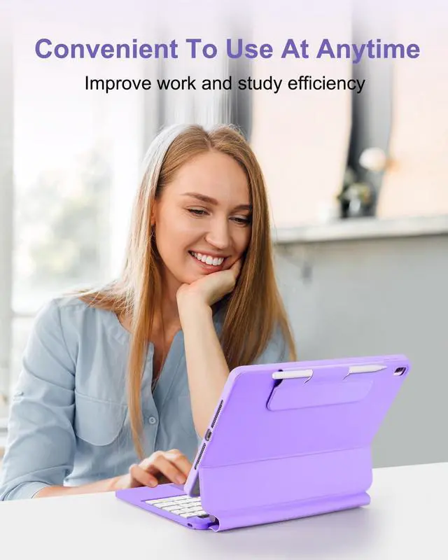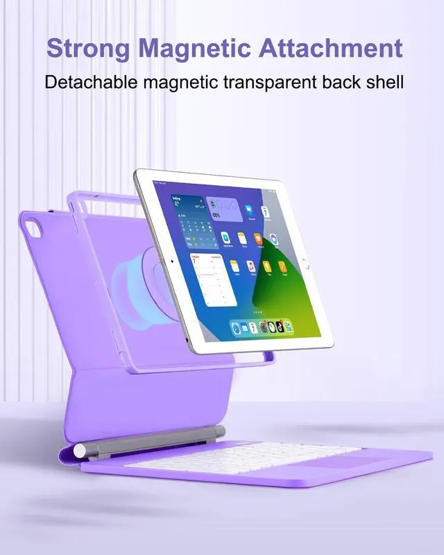 After click them 7 times, it will switch to breathing light mode, the backlight color will automatically switchincreasing fashion sense of the keyboard while providing a better typing experience ^^ Detachable Magnetic Cover, Support Horizontal or Vertical StandThis keyboard case come with a clear back cover that build-in strong magnetic, which support your iPad be adjusted to horizontal or vertical stand mode, allowing you to find the most comfortable way in various scenarios such as typing, reading books or watching videos. The clear back cover can be detachable, which can be used alone to protects iPad while increasing fashion sense of tablet ^^ Auto Sleep & Wake, Type-C Charging When keyboard is opened, your iPad will be waked up, so that you can start work immediately. when you close keyboard, iPad will enter sleep mode, which can reduce iPad's battery consumption & will extend battery life of iPad. This keyboard support USB-C Charging ^^