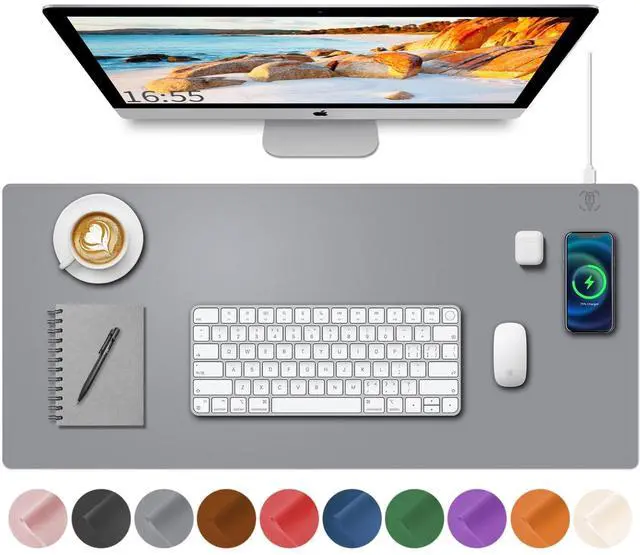 Desk Mat with Wireless Charging, Grey Mouse Pad with Wireless Charger, Desk Pad Matt for Desktop, Mousepad Gaming Large Mouse Pad, Leather Compute for Keyboard and Mouse, 32" x 16"
