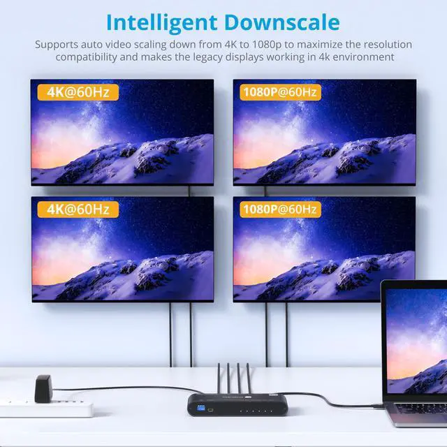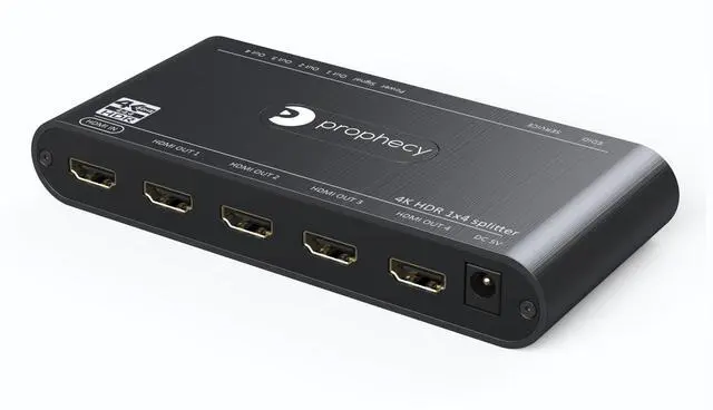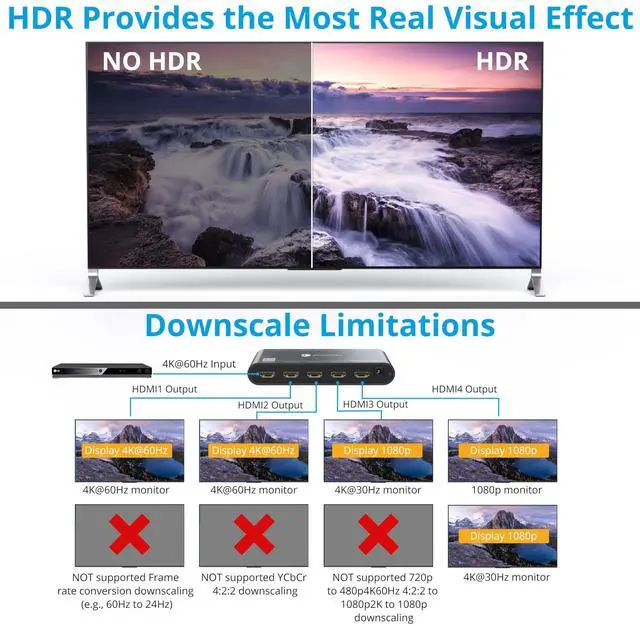 4-PORT HDMI 2.0 SPLITTER Distributes HDMI video & audio from a single source to 4 HDMI displays simultaneously without signal degradation; Compliant with HDMI 2.0 a, HDCP 2.2 / 1.4 with 18Gbps bandwidth; Supports splitter cascading up to 10 layers; *Note: Limit HDMI cable length to no more than 10m ( 32.8 ft); Contact us before purchasing if you are not sure about compatibility ^^ 4K HDR VIDEO & AUDIO Supports up to 4K @60Hz ( 4:4: 4 8-bit), HDR at 4K @60Hz ( 4:2: 0 10-bit), 3D, Deep Color; Supports 7.1 / 5.1 / 2.1 -ch audio, and the latest HDMI digital audio formats; Atmos is supported via AVR mode; CEC is NOT supported ^^ AUTO VIDEO DOWNSCALING Supports mixed 4K & 1080p display outputs; A 4K video source device can simultaneously display 4K content to 4K monitor (s) and 1080p content to 1080p monitor (s) via downscaling; Does NOT support mixed 2K & 1080p outputs; Use Elgato or other game capture device to record game play footage in 1080p, while actually playing in 4K; *Note: Does NOT support resolution downscaling from 4K @60Hz