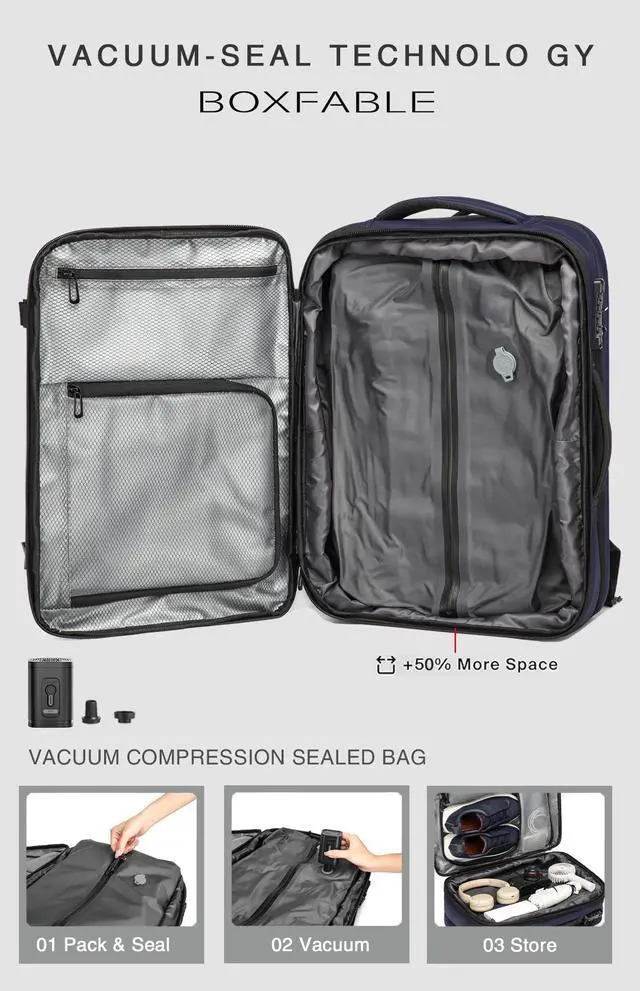 Revolutionary Vacuum Compression TechnologyThe BOXFABLE backpack features an integrated vacuum compression system with a built-in air pump, capable of storing 8-12 spring garments at once and reducing storage space by over 50% (even more for down jackets). Once fully expanded, the backpack achieves an impressive 45L capacity ^^ Upgraded Capacity to a 22" Suitcase This backpack, measuring 19 x 13 x 7.5, ensures hassle-free airline boarding. Our improved vacuum travel backpack features a 50% larger main compartment and a 50% larger air-tight compression bag. With an expanded design, the backpack's capacity ranges from 30L to an impressive 45L, making it perfect for extended trips.