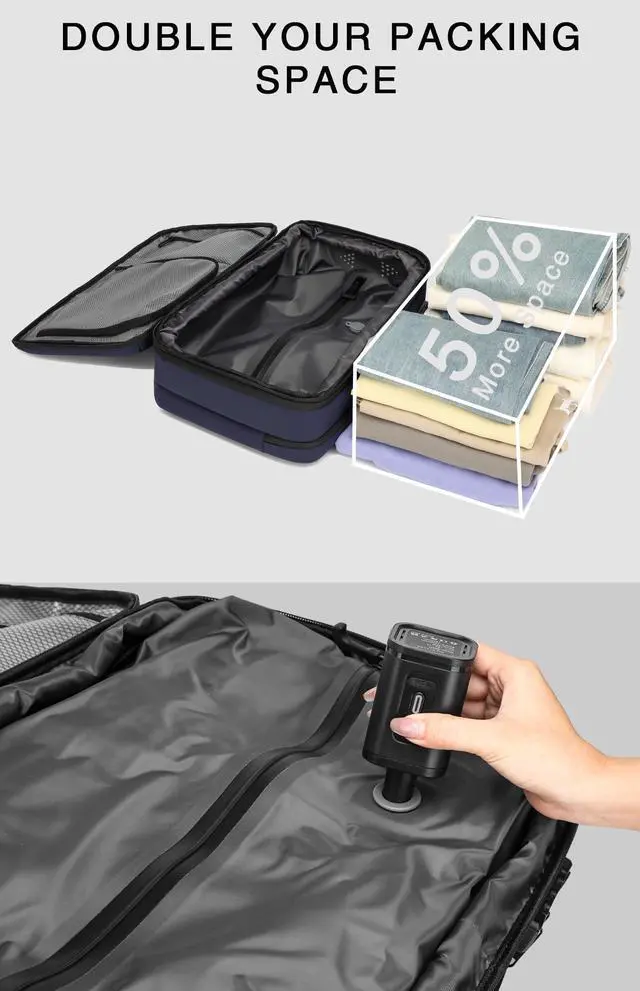 It features a vacuum compression bag made from high-performance TPU material that is both odor-proof and waterproof. A travel backpack vacuum compression system ensures you carry more with less bulkperfect for organized, space-saving trips ^^ Warm TipsPlease note that, to maintain the vacuum seal within the backpack, significant force is required to open the zipper. The air pump should be charged at least once a month during storage. If you encounter any issues with the backpack's quality or usage, please feel free to contact us, and we will resolve them promptly