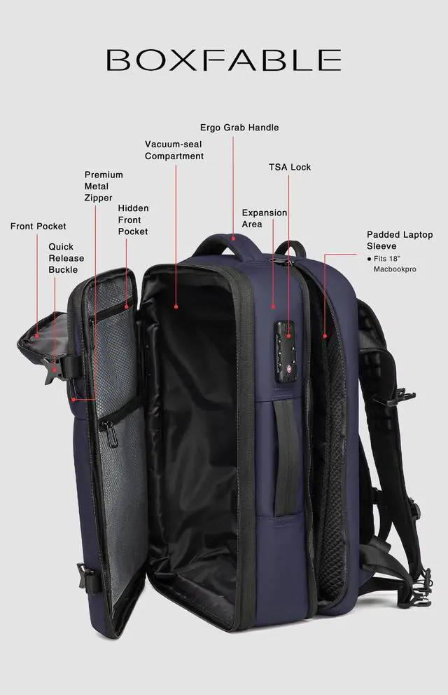 Additionally, a TSA-approved combination lock keeps your belongings safe and secure, providing peace of mind throughout your journey ^^ Multi-functional CompartmentsMen's vacuum travel backpack with three spacious main compartments and multiple hidden pockets. Travel backpacks come with shoe compartments that allow you to separate your shoes from your clothes and block out odors, ensuring your clothes remain clean and fresh on the go. In addition, there is a dedicated laptop compartment that can safely accommodate a 18-inch laptop without damage ^^ Ideal Travel CompanionThe BOXFABLE backpack comes equipped with a TSA-approved combination lock, a luggage attachment strap, thickened and widened shoulder straps, and high-quality zippers.
