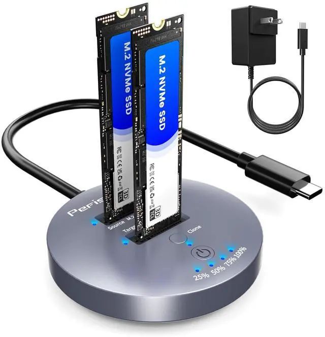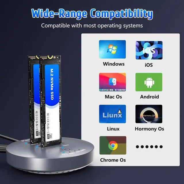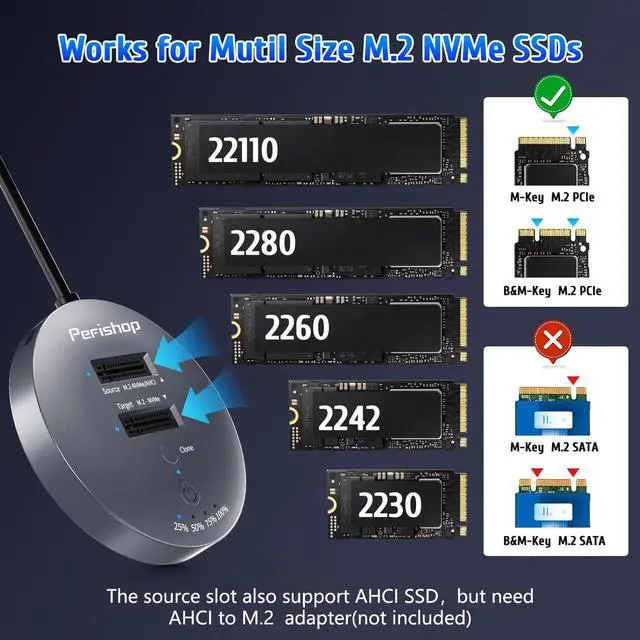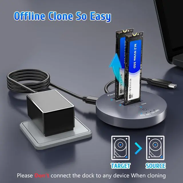 NOTE: This M. 2 NVMe cloner is not compatible with M. 2 SATA clones. ^^ Support Offline ClonerThis NVMe M. 2 cloner dock station can support offline clone and it is super easy to operate. Just insert 2 SSDs into respective slots, connect the power adapter (do not connect computer), Press the power switch, then long press clone button for 5 seconds until 25% light is flashing blue. Please note that the source disk capacity should not exceed the target disk capacity. ^^ Works with M. 2 PCIe SSDThe M. 2 SSD cloner supports M Key/B+M Key NVMe SSDs in sizes ranging from 22110 to 2230, Storage expansion capability up to 2x8TB. The source slot is also compatible with AHCI SSDs, though it requires an AHCI to M. 2 adapter (not included). ^^ Tool-Free & Driver-Free M. 2 SSD ClonerThe m. 2 dock station with tool-free design makes plug or unplug an M. 2 SSD smoothly, plug and play, Simply connect the docking station to your main device and start using it, ensuring a smooth and efficient workflow.