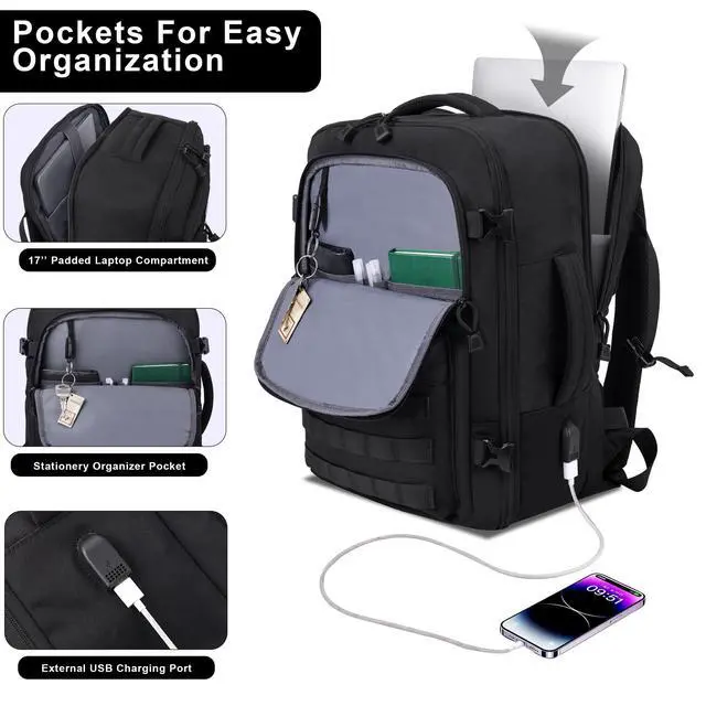 Dedicated Tech & Wet-Dry Protection: Equipped with a thickly-padded, suspended 17-inch laptop compartment, IPAD compartment and a separate wet-dry storage zone for toiletries, plus a built-in USB charging port for on-the-go power access. ^^