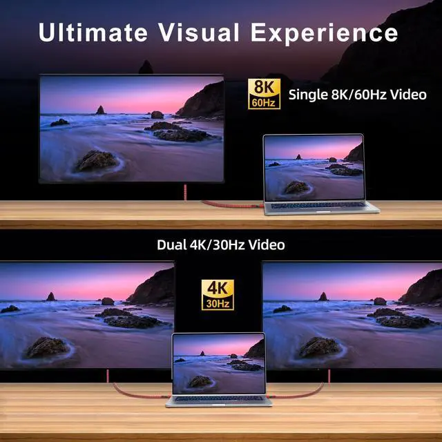 ^^ Single 8K&Dual 4K: The Thunderbolt 4 Cable supports a single 8K display feed and dual 4K video display, and connects directly to an external monitor via the Thunderbolt 4 port, giving you more screen real estate and higher resolution. Whether you're watching high-definition movies, recording video or processing images, it's easy to handle.