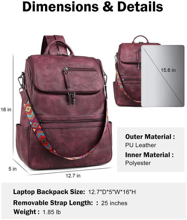 Quality Materials: 12.7"W *5"D*16"H, 1.85 lb. This women's leather laptop backpack is made of the latest waterproof PU vegan leather, soft and retro, quality hardware, smooth zipper without sticking, and reinforced design at the connection between the shoulder strap and backpack, making the leather backpack more durable. So this is a sturdy and stylish laptop backpack.