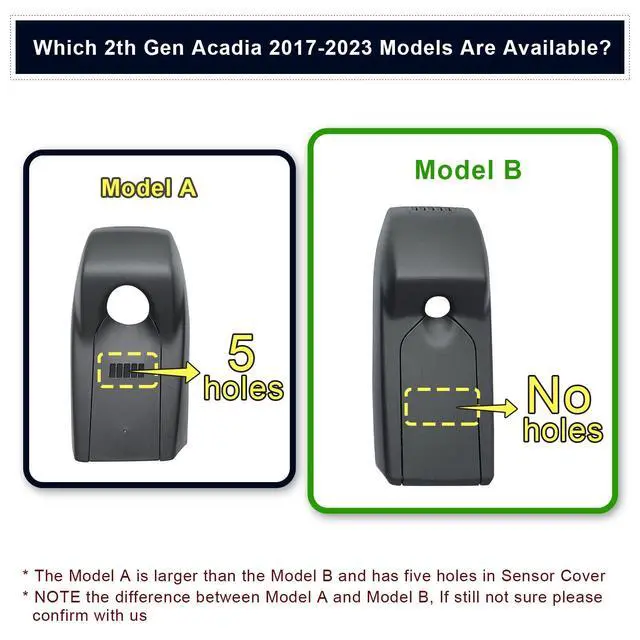 Power Adapter(asin: B0CXXXV4YG). ^^ Model A & Model BThe model A and model B match the same vehicle year and must be distinguished by the vehicle sensor cover. Seriously compare THE SECOND PICTURE and THE Third PICTURE. ^^ Custom fit for GMC AcadiaMangoal Front 4K & Rear 1080p dash cam can fit perfectly behind the rear view mirror like original. No messy wiring exposed, no complicated rewire at all. Perfectly intergrated with GMC Acadia 2017-2023 vehicle styles (Model B), Such as SE SEL SET AT4 Denali ^^ Loop Recording & G-SensorSeamless loop recording will overwrite the oldest footage with new content when memory card is full. G-Sensor detects a sudden collision and immediately save & lock current video to specified folder, prevents relevant footage from overwriting. ^^ What you getMangoal OEM Look 4K Dashcam x1, 128G MircoSD Card x1, Rear Cam x1, Rear Cam Cable x1, User Manual x1, OBD Power Adapter x1, Auto-Dimming Rearview Mirror Plug Power Adapter x1, Crowbar x1, Strap x2, worry-free 12-month warranty, and friendly customer service.