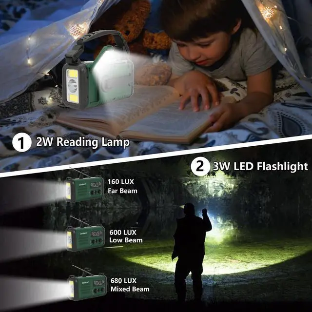 Mode Flashlight & Reading Lamp: The emergency radio features a powerful 3W LED flashlight (far beam, low beam, mixed beam and SOS flashing mode), which you can use to find your way in the dark or give emergency signals. This makes the device perfect for emergency situations or night expeditions. Turn on the reading light switch and the emergency crank radio transforms into a reading light with 10 built-in LED bulbs to illuminate a room or campsite.