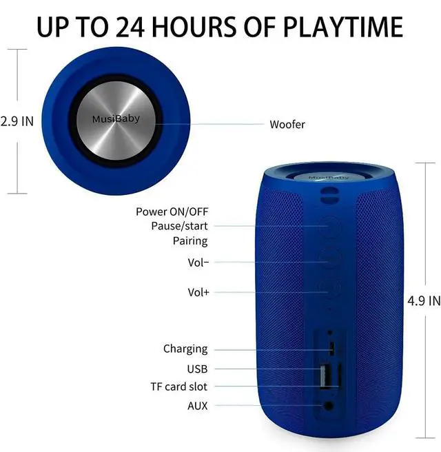 PORTABLE SPEAKER with LONG BATTERY LIFEBluetooth speaker, size only 4.9 * 2.9 in, light weight and portable. Designed as speakers bluetooth wireless, the speaker is with 1500 minutes playtime, long enough for any occasion. This portable speaker bluetooth is so great for either indoors or outdoors. Unleash the power of music wherever you go with the Musibaby M68 bluetooth speakers wireless. This wireless speakers with bluetooth is your ultimate portable Sound Companion! It must be a favourable gifts for women or men. ^^ SPEAKER with TRUE 360 STEREO SOUND & SUB-WOOFER BASSThis bluetooth speaker delivers surprisingly powerful stereo sound with deep bass enhanced by a built-in sub-woofer.