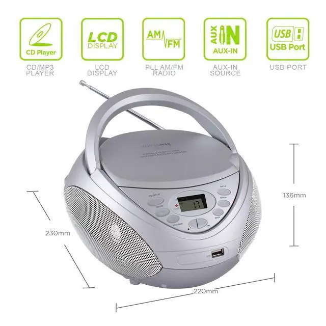 HANNLOMAX HX-326CD Portable CD/MP3 Boombox, AM/FM Radio, USB Port for MP3 Playback, Aux-in, LCD Display, AC/DC Dual Power Source. (Silver)