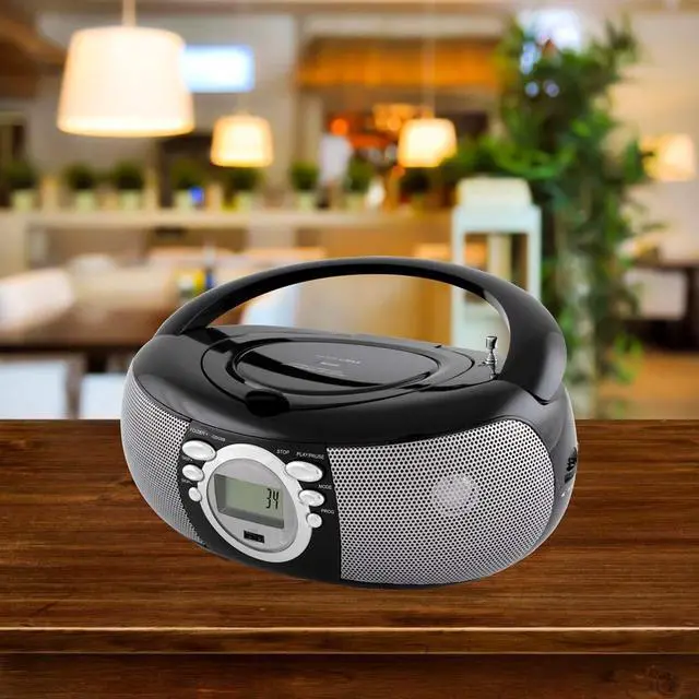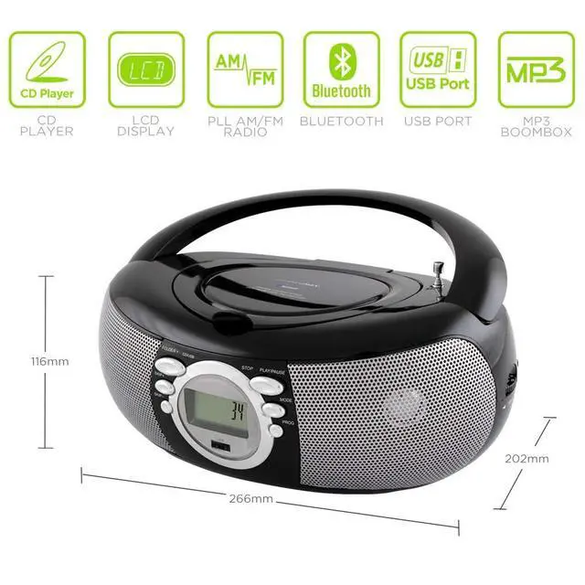 Portable CD/MP3 Boombox, AM/FM Radio, Bluetooth, USB Port for MP3 Playback, Aux-in, LCD Display, AC/DC Dual Power Source.