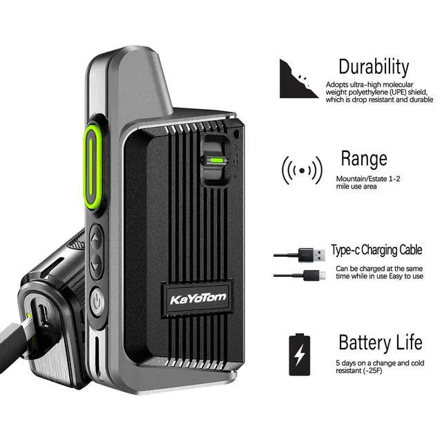 Two-Way Walkie-Talkie: Kayotom D12 Walkie-Talkie Has 16 Frs Channels, Maximum Communication Distance Of Up To 2 Miles (Or 25 Floors), One-To-One Or One-To-Many Communication Function Allows More Walkie-Talkies To Communicate On The Same Channel, So You Can Always Be Prepared And Connected With Those You Are Traveling With In The Instance You Run Into Bad Weather Conditions.