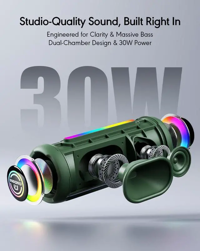 • 30W 2-Way Sound with Deep Bass: Experience rich, studio-quality audio. This professional 2-way speaker system delivers 30W of powerful, distortion-free sound. Dual passive radiators produce exceptionally deep bass, while dedicated tweeters ensure crisp highs. Instantly switch between three EQ modes (Music, Bass Boost, Vocal) for the perfect sound in any scenario.