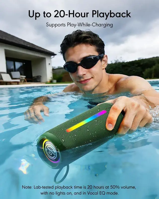 • IPX7 Waterproof & 20-Hour Playtime: Built for adventure. The IPX7 waterproof rating protects against full water immersion, making it perfect for the pool, beach, or shower. The large 5000mAh battery provides up to 20 hours of playtime (Playtime varies with volume, EQ mode, and light usage), powering through all-day outings.