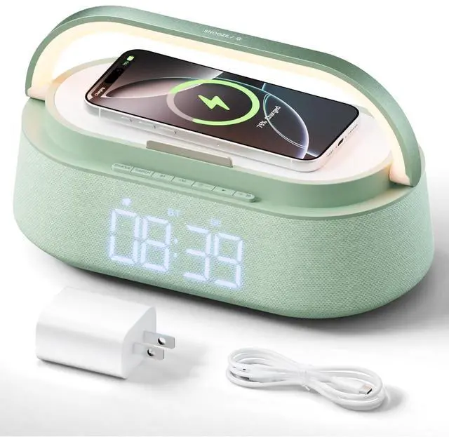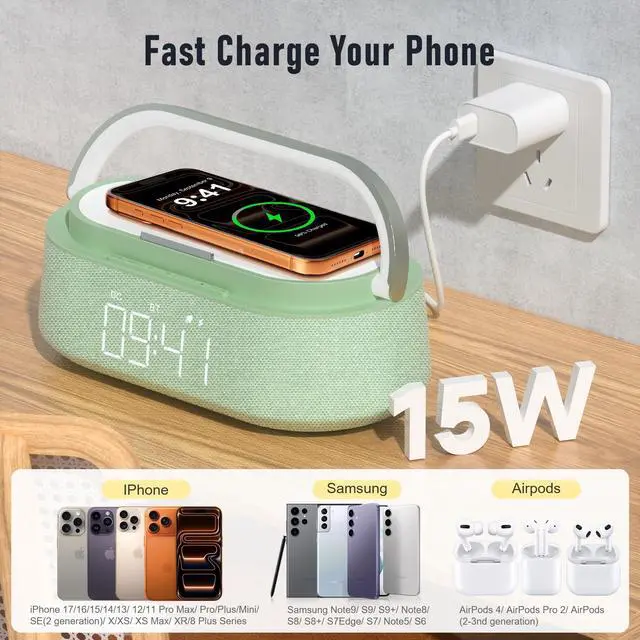 Alarm Clock: The smart alarm clock combines a bluetooth speaker, wireless charger, FM radio, digital alarm clock, adjustable night light, and phone stand all in one. Its integrated design caters to various needs throughout your day. ^^ 15W Fast