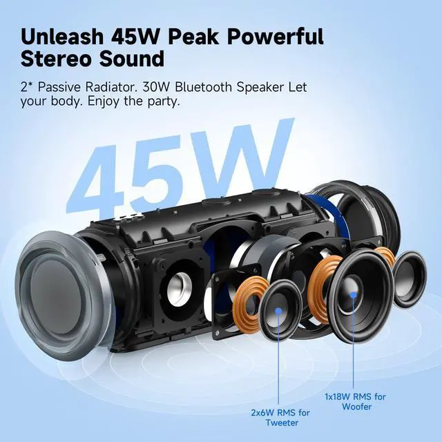 Outdoor Adventures: Experience crisp, room-filling audio with 30W RMS/ 45W Peak dual drivers and advanced bass boost. Perfect for bike rides, motorcycle trips, pool parties, and golf outings, this floating Bluetooth speaker delivers distortion-free sound even at max volume. The rugged, mountable design makes it ideal as a bike mounted Bluetooth speaker or motorcycle speaker, with IPX7 waterproofing for all-weather use ^^ IPX7 Waterproof & Floating Design Take Music Anywhere: This floating Bluetooth speaker is IPX7 waterproof, surviving rain, splashes, and even pool submersionperfect for kayaking, beach days, or shower jams. Its anti-slip base and bike mount compatibility also make it a top Bluetooth speaker for motorcycle or bicycle handlebars, with dustproof durability for off-road adventures ^^ Bluetooth 5.3 & Secure