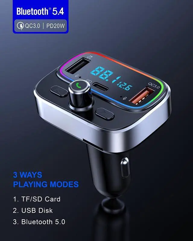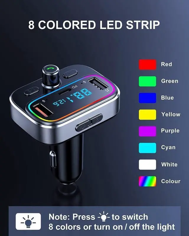 & PD 20W: FM transmitter for car Coming with 2 USB ports (Fast Charging 18W and PD 20W), You can charge two devices simultaneously. The PD Port up to 20W output, compatibility with lastest iphone, ipad, cellphones, tablets etc. ^^ 7 Colored LED Strip & Music Play Modes: FM Transmitter Bluetooth car adapter supports 7 colors LED backlight, including red / green / blue / yello / purple / cyan / silver white, will give you a visually stunning display of colors, which is a nice way to match the colors already in the car. You can stream music on your car stereo via Bluetooth/ USB Disk (32GB) / microSD Card (32GB). ^^ LED Voltmeter Display & Voice Assistant: The FM transmitter will display cars voltage when plugged into the cigarette lighter. Keep abreast of car battery health at all times to avoid problems when driving. Also it support active Siri, Google Assistant or Samsung Bixby to make phone calls.