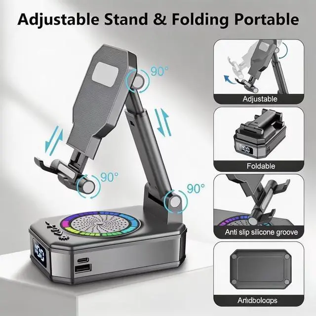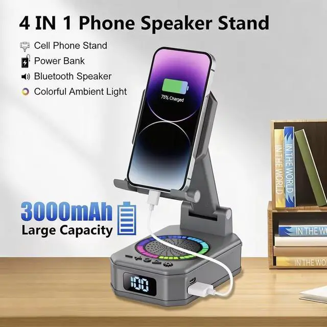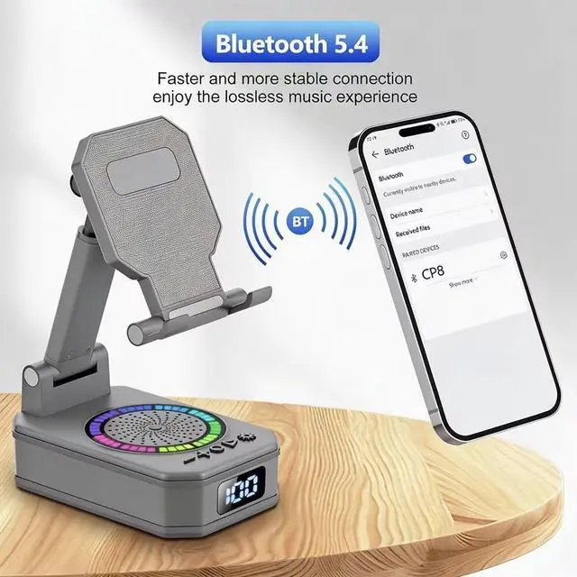 Cell phone stand with speaker built-in 3000mAh capacity battery, supports long-term Bluetooth speaker playback,and can also be used as an emergency power source to charge mobile phones and tablets. It is a travel charging gadget for your outdoor adventure (Not wireless charging). 5.3 Bluetooth technology, the connection is fast and stable,and ensuring smooth transmission of sound quality.