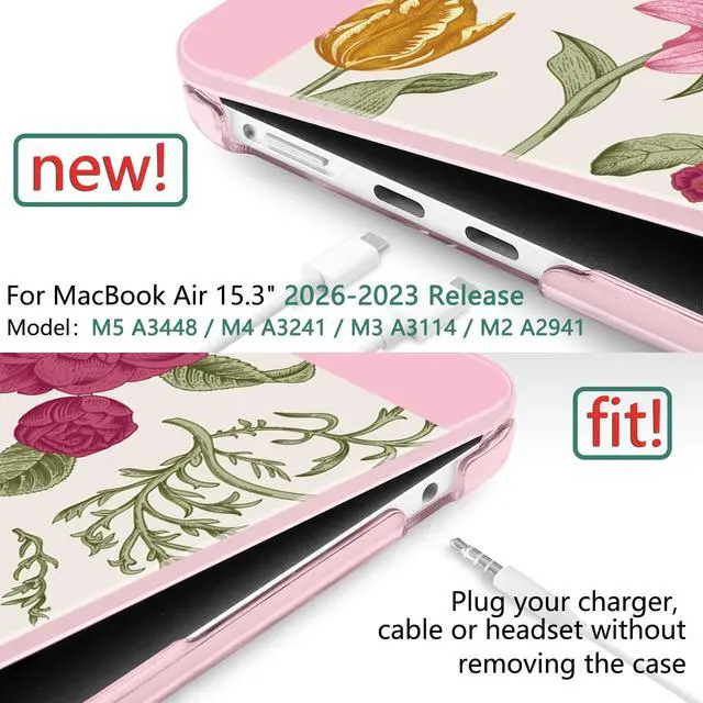 M5 (Model: A3448, 2026 Release). Also fits M4 A3241 (2025), M3 A3114 (2024), and M2 A2941 (2023). Please check the model number "Axxxx" on the bottom of your laptop before purchase to ensure a perfect fit. ^^ [Vibrant Patterns & Long-Lasting Beauty] Features high-definition UV printing with stylish, artistic designs that are resistant to fading, peeling, and scratching. This durable hard shell protects your MacBook Air 15 from daily scuffs and abrasions while showcasing your unique personality with a premium, long-lasting finish. ^^ [Ultra-Slim & Lightweight Design] Crafted from premium polycarbonate, this two-piece snap-on case is tough yet incredibly thin. Weighing only 13.4 oz, it adds zero bulk to your laptop, preserving the sleek aesthetic of the Air 15 while providing a secure, natural grip in your hand. ^^ [Safe Cooling & Precise Access] Fully vented at the bottom for safe heat disbursement to prevent overheating. All ports and features, including magnetic charging port, USB-C, and Touch ID, are easily accessible with precise cutouts. No need to remove the case to plug in your charger, cable, or headphones.